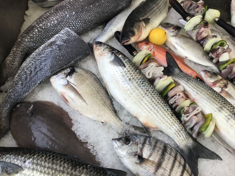 Variadade de peixes frescos grelhados no carvão